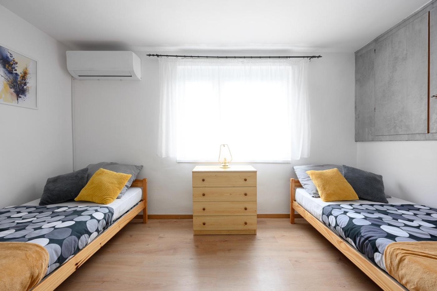 Two-Bedroom Apartment. This spacious apartment is comprised of 1 living room, 2 separate bedrooms and 1 bathroom with a bath and a hairdryer. The well-equipped kitchen features a stovetop, a refrigerator, kitchenware and an oven. The air-conditioned apartment offers a flat-screen TV with streaming services, a washing machine, a coffee machine, a wardrobe as well as garden views. The unit offers 4 beds.